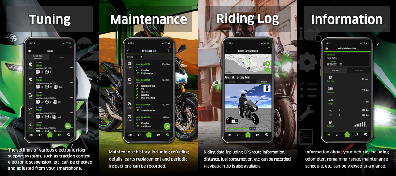 Clever technology enables riders to connect to their motorcycle wirelessly. Using the smartphone application “RIDEOLOGY THE APP” a number of instrument functions can be accessed, contributing to an enhanced motorcycling experience. Vehicle information (such as the odometer, fuel gauge, maintenance schedule, etc) can be viewed on the smartphone. Riding logs (varies by model, but may include GPS route, gear position, rpm, and other information) can be viewed on the smartphone. When connected, telephone (call, mail) notices are displayed on the instrument panel. Riders can also make changes to their motorcycle’s instrument display settings (preferred units, clock and date setting, etc) via the smartphone. And on certain models, it is even possible to check and adjust vehicle settings (such as Rider Mode, electronic rider support features, and payload settings) using the smartphone.