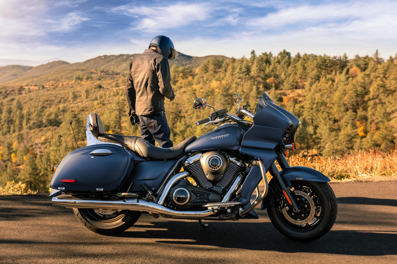 Muscular front cowling and wind deflector, key bagger styling elements, offer protection from the wind and weather. Mounting the cowling to the frame rather than the handlebars contributes to light handling and minimises effect of wind buffeting.